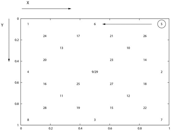 The analysis of eye movement characteristics was conducted with the usage of a data set collected during the experiment based on a “jumping point” represented by a dark dot of size 0.5 × 0.5. This dot was shown in 29 various locations distributed over a white 1280 × 1024 (370 mm × 295 mm) flat screen. Coordinates of each location were defined in the universal scale where the (0.0, 0.0) point is located at the top–left–hand corner and (1.0, 1.0) one at the bottom–right–hand corner of the screen (Figure 1). A point position, expressed in degrees of visual angle or in a metric system, may be calculated based on the screen size and eye–screen distance. In the case of the presented studies, the horizontal and vertical visual angles amounted to approximately 40° and 32°, while the eye–screen distance was equal to 450 mm. Each point was displayed for 3000 ms, during which the point size was changing in order to facilitate the keeping of users’ concentration.