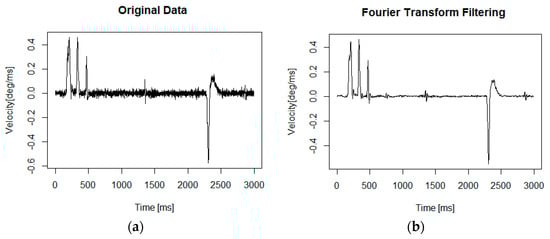 An example time series (a) in original form (BNR) (b) after noise reduction (ANR). The horizontal axis is represented in ms, the vertical in degrees of visual angle per ms. Another example of the ideal low–pass filter application may be found in [21].