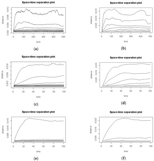 Two issues were considered at the beginning of the time series analysis. At first, both their types were explored in terms of temporal correlation by examination of space-time separation plots obtained with usage of the stplot function from the tseriesChaos package [38]. Their visual inspection revealed that the safe temporal separation for defining a Theiler window equals to 100. Figure 3 presents examples of space-time separation plots acquired for the same time series, before and after noise reduction—plots Figure 3a,b respectively and—visible in a shorter time perspective—Figure 3c,d. In the same time period another time series BNR and ANR was shown on plots Figure 3e,f to illustrate some differences in the saturation of contour lines. These differences may be noticed (1) among BNR and ANR times series—Figure 3c,d and Figure 3e,f—on the left-hand plots, lines saturate slightly quicker; and (2) among the same time series types BNR (Figure 3c,e) and ANR (Figure 3d,f).