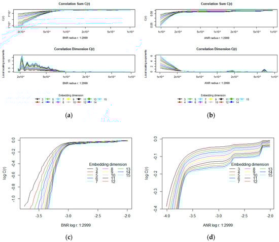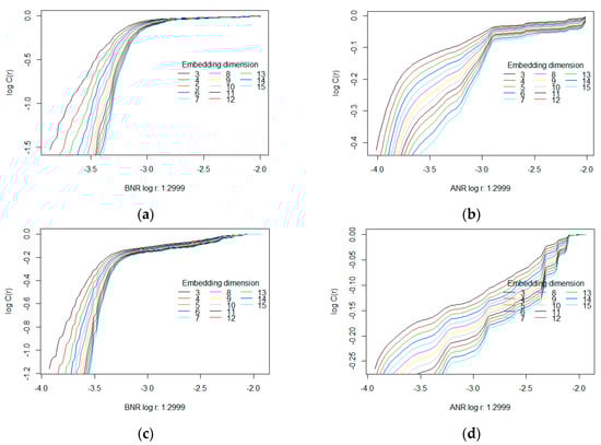 The next two required parameters, the number of radiuses analysed in the range of (rmin, rmax) and the Theiler window, were set to 100. Plots of correlation sums, scaling exponents and log(C(r)) vs. log(r) for a sample time series, before and after noise reduction, are presented in Figure 4. The two first mentioned plots are visible in Figure 4a,b on the top and at the bottom of the panels, respectively, while log-log charts are shown in Figure 4c,d. The left-hand part of Figure 4 is dedicated to the BNR time series. On the right, the plots related to the ANR time series are shown.