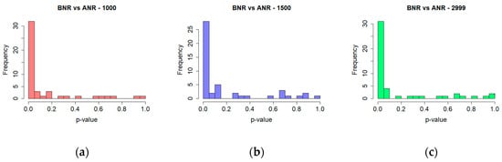 Significance of differences in the correlation dimension values for time series before noise reduction (BNR) and after noise reduction (ANR)—histogram of p-values for time series of length (a) 1000; (b) 1500; (c) 2999.