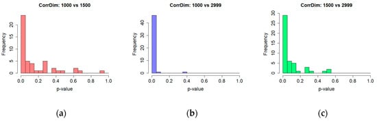 Significance of differences in the results obtained for the correlation dimension for different time series lengths—histogram of p-values for ANR time series of length (a) 1000 vs. 1500; (b) 1000 vs. 2999; (c) 1500 vs. 2999.