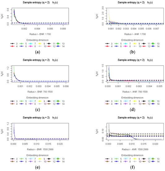 Plots of the entropy computed for: various embedding dimension, a given set of radiuses and three scopes: <1…700>—panels (a,b); <700…1500>—panels (c,d); <1500…2999>—panels (e,f). The BNR time series plots are shown in left-hand side panels while the ANR on the right.