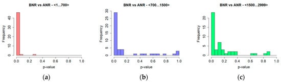 Significance of differences in the entropy values for time series BNR and ANR—histogram of p-values for various time series scopes (a) <1..700>, (b) <700…1500>, (c)<1500… 2999>.