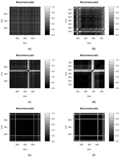 The existence of these differences may also be explored by means of the recurrence plot(Figure 11), a graph with time series elements located on axes X and Y according to their occurrence order. If i-th and j-th elements overlap each other, a point (i; j) is black on this plot. It is white when points are placed as far apart from each other as possible and shades of grey represent intermediate distances [47]. Figure 11a,c,e show recurrence plots for the three BNR time series in scope of <700…1500> elements, whereas Figure 11b,d,f contain the corresponding charts for the ANR sets. While comparing plots in the same row, it may be noticed that those obtained for the ANR time series have larger black areas; indicating smaller distances between chart elements, thus similar time series values; and wider white parts that represent elements with certainly greater distances from the rest of the points. The left-hand plots, although exposing similar general patterns, feature with less density, meaning that the smaller and larger distances between the values represented by the graph points occurred alternately. Additionally, the diagonal line which represents distances of points to themselves, is better visible in the right-hand plots. This provides another source of confirmation that neighbouring elements in the ANR time series are closer to each other than in the case of the BNR collections.