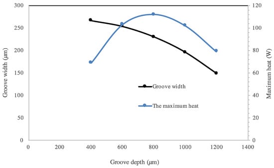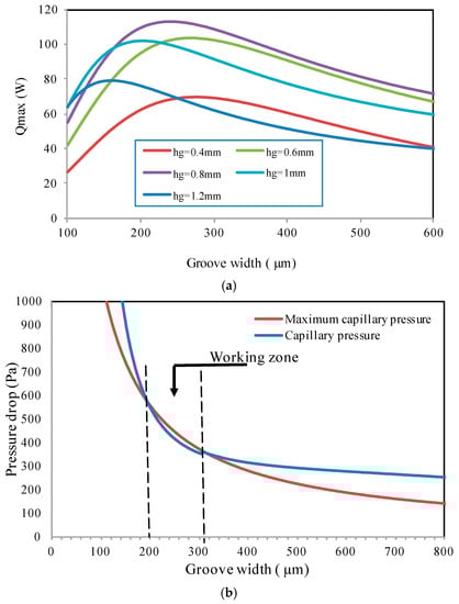 - The effect of microgroove width and depth for a flat heat pipe was investigated. It can be seen that increasing microgroove width increases the maximum heat for low values of width and decreases it for high width values. An optimal width and depth were defined for the highest maximum heat.