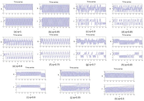 The chaotic time series is a definite motion that determines the presence of a system. The chaotic time series is a time series with chaotic-model characteristics. The chaotic time series contains the rich dynamic information of the system. The study of chaos from the time series began with Packard et al. []. In terms of the chaotic time series, it is known that the periodic motion corresponds to the rules sequence, and the chaotic motion corresponds to the irregular sequence; therefore, it is possible to intuitively determine whether the system is chaotic by observing the systemic time series. The fraction q can be changed from 1 to 0.5 by 0.05 steps to obtain the time series through the implementation of a computer simulation, as shown in Figure 1.