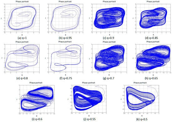 Phase portrait of the system with different fractional order q values, and subfigures (a–k) are the fractional order q changed from 1 to 0.5 by 0.05 steps.