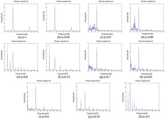 Figure 3 shows that when the fraction q is equal to the four cases of 1, 0.95, 0.8, and 0.75, the power spectrum is a discrete spectrum. At these moments, the system is in a periodic state. In the remaining situations, the power spectrum is a continuous spectrum, or a chaotic state, so the system exhibits a segmented chaotic state. This conclusion is consistent with the phase-portrait results.
