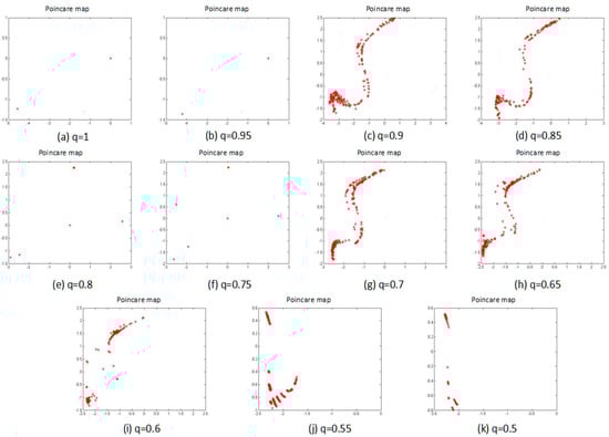 Therefore, the points, which are left on the Poincaré map to judge the system status, can be observed. Figure 4 shows the results of the Poincaré map as the fractional order was changed.