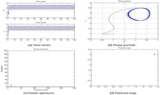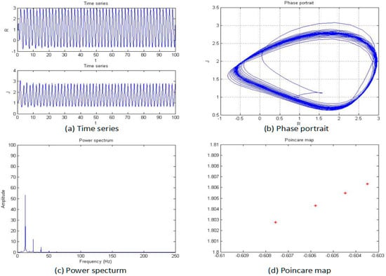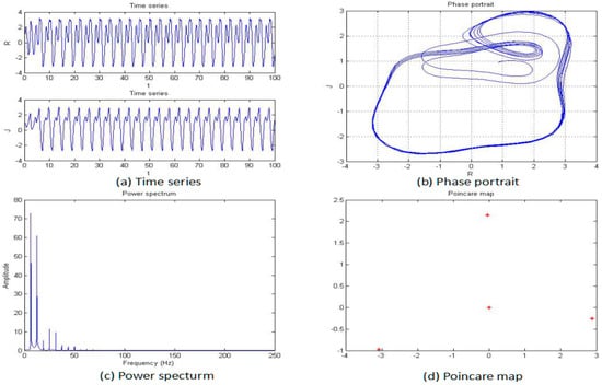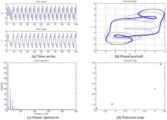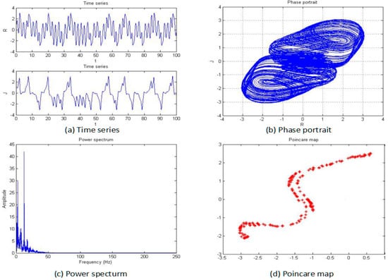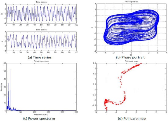 The power spectrum of a signal represents the power or more simply the energy of the signal at each frequency. It can also be considered as the range or spectra of energy or power of the given signal derived from the signals’ range of frequencies. Therefore, a power-spectrum analysis can provide the frequency-domain information of the signal. From an analysis of the power spectrum, it is possible to observe whether the systemic characteristics are chaotic or not. For the periodic motion, the power spectrum is a discrete spectrum, while for the chaotic motion, the power spectrum is a continuous spectrum. It is possible to determine whether the system is chaotic by plotting the power spectrum of the system-generated signal. The power spectrum of the system shown in Figure 3.