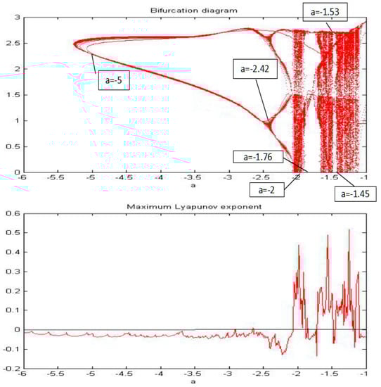 From Figure 5, Figure 6, Figure 7, Figure 8, Figure 9 and Figure 10, it clearly shows when the parameter “a” is equal to −2 and −1.53, the system is in the chaotic state, and in the other situations, the system is in the periodic state. Therefore, it is possible to initially conclude that when the fractional order of the system is fixed, the system shows the periodic and chaotic states as the parameter “a” is changed. To verify the accuracy of the conclusion, the results of the MLE and the bifurcation diagram are shown in Figure 11.