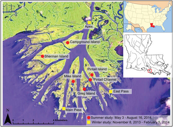 Map of Wax Lake Delta (WLD) showing the locations of the field and modeling analysis. The circles are from the summer field campaign measuring water level on five islands and one channel from 3 May to 16 August 2014. The yellow squares are channel data from a field campaign from 8 November 2013 to 5 February 2014. Image is a Landsat 8 satellite photo from 19 June 2014, courtesy of the United States Geological Survey (USGS). Inset images show location of Louisiana in the USA and the location of WLD in Louisiana.