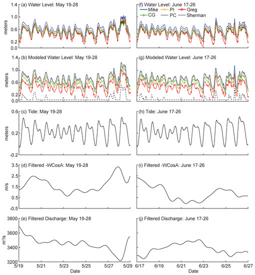 Time series of water level, modeled water level, tide, filtered wind, and filtered discharge for two time periods (a–e) 19–28 May and (f–j) 17–26 June 2014. For the water levels, PI = Pintail Island, PC = Pintail Channel, and CG = Campground Island. Wind and discharge are filtered using a 5th order Butterworth filter.