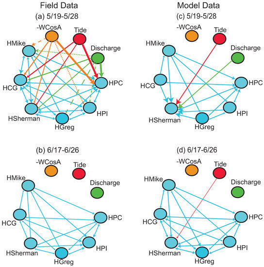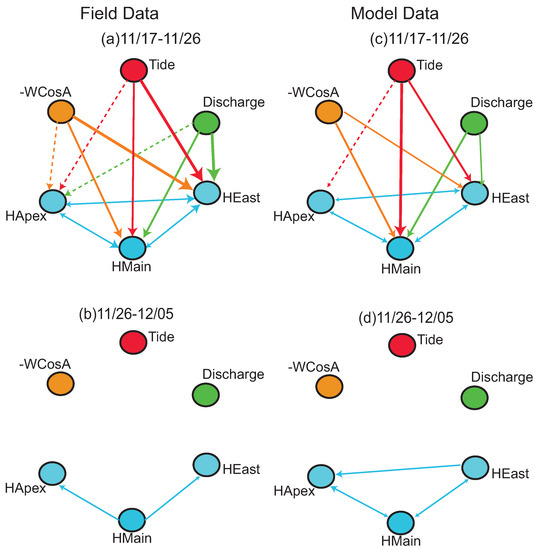 Process networks for high frequency water levels (HLocation) showing the (a,b) field and (c,d) modeled process connections for two time periods: 17–26 November and 26 November–5 December 2013. Within a network, arrows from wind (-WCosA), tide, and discharge are arranged in order of most persistent (thickest line) to least persistent (dashed line) for each location. The color of the arrow identifies the driver node. Among water levels, the biggest arrowheads refer to the most persistent relationships.