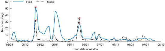 Summing the number of links in each process network and viewing this number for all windows, we see that couplings from modeled results are overall underestimated compared to results from the field data (Figure 4). However, there are windows where the modeled number of couplings is overestimated, such as in the 17–26 June window. Both field and modeled data show a decrease in the number of couplings through time, starting with windows in mid-June.
