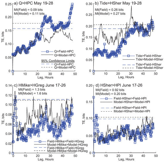 Transfer entropy (TE) results within a window. Dashed lines are 95% confidence limits. (a) Information transfer from filtered discharge (Q) to high frequency modeled and field water level for Pintail Channel (HPC) for the window 19–28 May; (b) TE from tide to Sherman Island high frequency water level (HSher), for field and model data, for the 19–28 May window; (c) TE from high frequency water level on Mike (HMike) to high frequency water level on Greg (HGreg) from 17–26 June; (d) TE from high frequency water level fluctuations on Sherman Island (HSher) to high frequency water level fluctuations on Pintail Island (HPI) from 17–26 June. Each window also shows the mutual information (MI) value for that relationship.