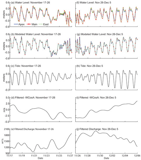 Daily tidal fluctuations are measured for field and modeled water level for the 26 November–5 December time period, though the fluctuations for modeled water level at Apex are stronger than the field measured water level at the same location (Figure 6f,g). Tide transitions from neap to spring (Figure 6h) and wind transitions from a North wind to a South wind (Figure 6i). Discharge decreases from 1900 to 1200 m3 s (Figure 6j).