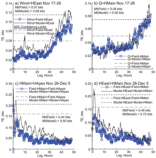 Transfer entropy (TE) results within a window. Dashed lines are 95% confidence limits. (a) Information transfer from filtered wind (FWCosA) to high frequency modeled and field water level for East Pass (HEast) for the window 17–26 November; (b) TE from filtered discharge (Q) to Main Pass high frequency water level (HMain), for field and modeled data, for the 17–26 November window; (c) TE from high frequency water level on Main (HMain) to high frequency water level at Apex (HApex) from 26 November–December 5; (d) TE from high frequency water level fluctuations at East Pass (HEast) to high frequency water level fluctuations at Main Pass (HMain) from 26 November–5 December. Each window also shows the mutual information (MI) value for that relationship.