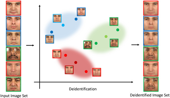 The main idea of the k-Same family of algorithms is illustrated in Figure 2. The algorithms take a closed set of N images as input and produce a set of N deidentified images that cannot be linked to the inputs in an unambiguous manner. Here, anonymity is ensured by identifying clusters of k images in the input-image set and replacing all k images of each cluster with the corresponding cluster centroid. As a result, the deidentified image set contains k copies of each computed centroid, and consequently, each image (or centroid) in bears similarities to all k images in the corresponding cluster. The outlined procedure makes it impossible to link any individual from to the individuals from with a probability higher than and provides formal guarantees with respect to the anonymity of the deidentified data. Note that these guarantees apply only if the images in belong to exactly N identities, and hence, each subject in is represented with a single image only.