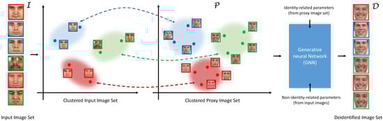 Consider a set of N input images belonging to N identities and a second (proxy) set of M images corresponding to Q identities, where . Furthermore, assume that our goal is to map the images in to a target set of deidentified images in such a way that no relation between the subjects in and the images in can be established without ambiguity.