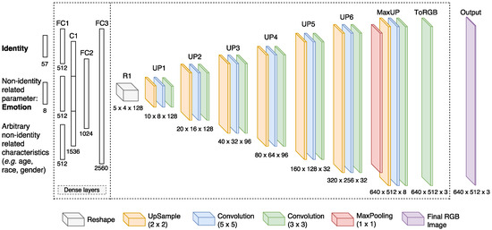 Our GNN architecture is built using fully connected (dense) layers (denoted as FC1, FC2, FC3) and concatenation layer (denoted as C1), followed by six deconvolutional layers (performing upsampling and convolution, from layer UP1 to UP6 as denoted in the figure). Final layers in the network include combination of max pooling and upsampling (denoted as MaxUP) layers and the three-channel convolution (denoted as ToRGB) layer, respectively. Inputs to the GNN are one-hot encoded, which means that many input combinations are possible (e.g., multiple identities). On the output, GNN renders a colored face image through the layer ToRGB as illustrated in the figure.