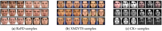 For our experiments, we use three publicly available datasets of face images, i.e., Radboud Faces Database (RaFD) [54], The Extended Multi Modal Verification for Teleservices and Security database (XM2VTS) [55] and The Extended Cohn-Kanade Dataset (CK+) [56,57]. We employ the first dataset to train our GNN and the latter two to demonstrate the deidentification and data utility-preservation capabilities of k-same-Net. Some example images from the three datasets are shown in Figure 5.