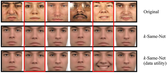 Preserving data utility. The top row shows the original images from the subject-specific input set ; the second row shows images deidentified with k-Same-Net without preserving any of the input information; and the last row shows k-Same-Net results where the facial expressions of the originals are retained in the deidentified images. Note that the two images that are marked red belong to the same cluster () and have been deidentified in the last row using the same artificial target identity, but a different facial expression.