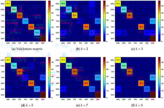 Confusion matrices of the utility-preservation experiments for the DeXpression model: (a) the reference matrix generated on the original CK+ images; confusion matrices after deidentification with k-Same-Net for: (b) ; (c) ; (d); ; (e) ; and (f) . Note that a high expression recognition performance can still be achieved on the deidentified data.