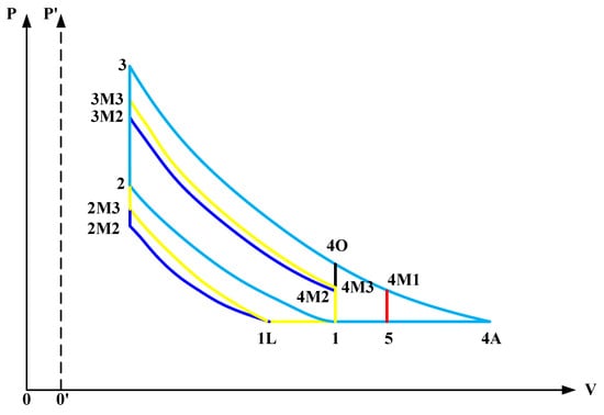 In the figure, 1-2-3-4O-1 is an Otto cycle, and 1-2-3-4A-1 is an Atkinson cycle process. The other three processes that are 1-2-3-4M1-5-1, 1-1L-2M2-3M2-4M2-1 and 1-1L-2M3-3M3-4M3-1 are an over-expansion Miller cycle (M1), an LIVC Miller cycle (M2) and an LIVC Miller cycle with CCR (M3), respectively.