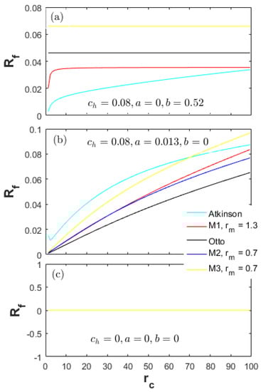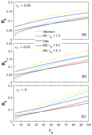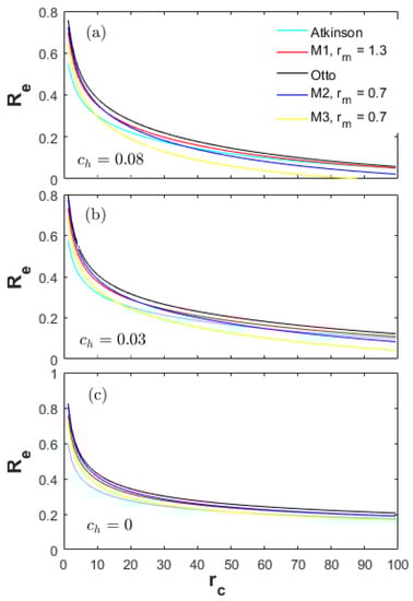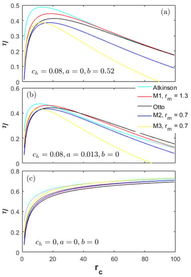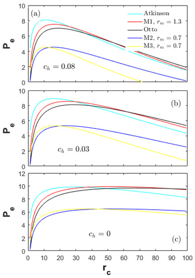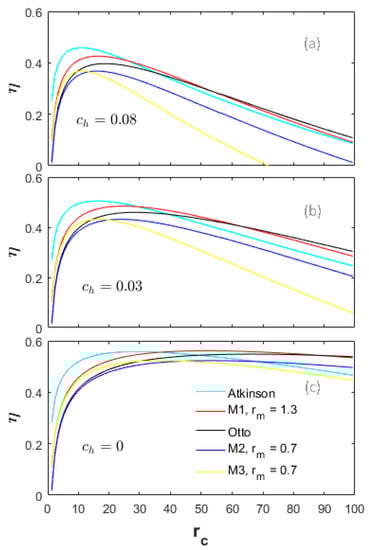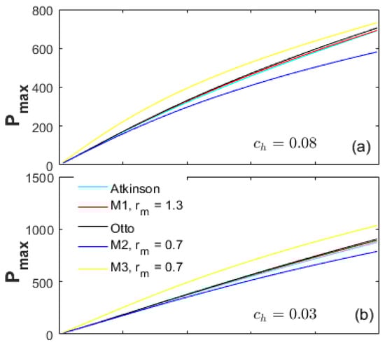 The corresponding values for the M2 and M3 cycles are similar as that for the Otto cycle (or M1 and Atkinson cycles), which can be achieved by replacing , and with (, ), (, ) and (, ), respectively. The of the M2 cycle is the same as that in the Equation (28); the of the M3 cycle is less than the other cycles and can be expressed as: