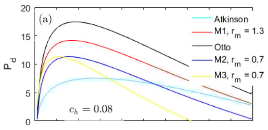 Figure 4 shows a comparison of the power density () at different values. The peak power density for the Atkinson cycle is the lowest and even lower than the M2 and M3 cycles because of the largest displacement volume Vd. In the full CR range examined, the power density for the Otto cycle is always the highest because of the modest effective power and Vd.