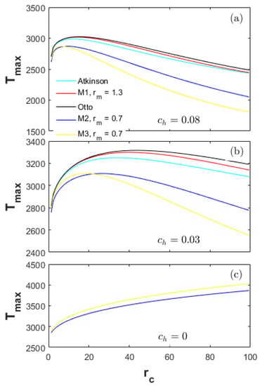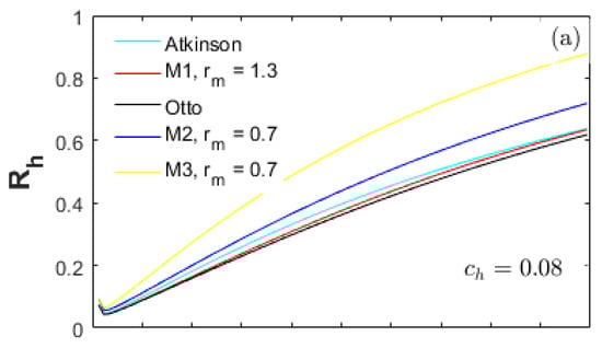 Figure 5 is a comparison of the heat-transfer loss ratios () for all cycles examined. As shown in Figure 5a,b, the of the Otto cycle is the lowest; and the one for the M3 cycle is the highest in the full CR range examined ().