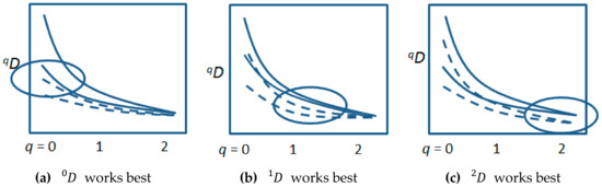 Confidence limits for values for two hypothetical localities, one locality shown as a pair of solid lines, the other locality shown as a pair of dashed lines (the mean curves would be between the two confidence limits, but are omitted for clarity). The circled areas in each of the three panels show cases where discrimination between the assemblages of species or genes at the two localities is more clearly identified by (a) q = 0, (b) q = 1, or (c) q = 2, respectively.