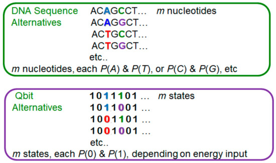 It is likely that the similarities of biological evolution and evolutionary algorithms will become more noticeable when quantum computing becomes a day-to-day reality [60,66]. This is because of the probabilistic and parallel nature of quantum computing mimics biology closely. First, the behavior of qbits is stochastic, collapsing, upon observation, to one state or another with probabilities determined by the prior input of energy to that qbit [63,72]. Second, it is said that massive parallelism will be important for efficient quantum computing [63,72]. The result is that quantum computing displays some close similarities to a process called balancing selection in biology, where two allelic states are maintained in a population (equivalent to the computer parallelism), with their relative frequencies maintained by selective forces that act against individuals that contain only one type of allele. In stochastic genetic systems, this situation has the counterintuitive behavior that if the expected equilibrium proportions are near the absorbing boundaries—0 or 1—then the forces that would be expected to maintain both variants actually increase the chance of losing one of the variants [73,74]. In future, this behavior may also occur in quantum computing. Again, Shannon’s utility in assessing selection might be useful for quantum computing, just as for evolutionary computing. Figure 2 shows an example of analogy between DNA nucleotides and qbits, in cases where there is independence within each system, i.e., no linkage of DNA nucleotides and parallelism of qbits. As described above, there are already extensive methods to deal with the cases where DNA nucleotides are not independent (i.e., “linked”), which can also happen with qbits.