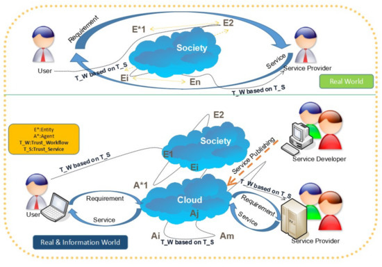 As one of the chaotic effective metrics of the member systems that belongs to the workflow management system (WfMS), information entropy reflects the uncertainty of its trustworthiness, covered with gradually deepening layers from top to bottom, i.e., system engineering [1], service computing [2], and software engineering [3,4]. Under the iterative process, the entities in the real world and their relationships would evolve into more complex entities, and with the emergence of the Internet, their relations present new hybrid features that are mixed with the environment of the real world (origin) and the information world (migrated). When in doubt, in order to detail and summarize the complex evolution progress of WfMS, we must rely on a multidisciplinary view to carry out the relevant research works of WfMS, so that the trustworthy workflow of the service layer, which is between the system layer and software layer, can be verified and validated by the users in Figure 1. Just as ourselves feeling, the Entity (E*) and Agents (A*) are intertwined with each other, covering the real world and information world with the Trust_Workflow (T_W) based on the Trust_Service (T_S), into business processes among the users and service developers or providers. What needs to be particularly pointed out is that the Trust_Service (T_S) is encapsulated by the various instances of society and its digital form, i.e., cloud computing. Obviously, the Real and Information world in the lower part of Figure 1 have experienced a deep evolution far from the purely original Real World, without digitization present in the upper part of Figure 1, which consists of proxies with a single type, i.e., the Entity type. While the services were transferred from Service Providers to Users through Entities, a belief network was created that underlies the workflow consisting of the services. Therefore, the Trust_Workflow (T_W) was generated based on the Trust_Service (T_S). Progressively, with the digitalization evolution in the Real World, some entities undertake mechanized repetitive operations. These are selected out and changed into intelligent agents, which results in the emergence of the Real and Information World. As we know, compared with the original Real World, whatever the functions of the Real and Information World, the T_W in the Real and Information World should be maintained at the same level or at a higher level than the original Real World. Hence, we should conduct further research on the T_W from the top layer, i.e., system layer and its middle layer can focus on the service, and those on the bottom layer should focus on the software. As the early stage of this work, in this paper, we put the emphasis on the system layer in advance.