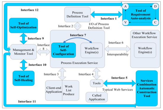 (9) Interface #9 is linked to the management and monitor tool with the self-optimization framework system for the WfMS (SOF4WMS) RE tools, which contributes to the TWfMS mechanism with the SCP4WMS tools. That is, we consider the SOF4WMS tool an extension of, and supplementary to, the original management and monitoring tool [33]. As a supplementary component of WfMS and dependent on TWfMS, we make the assumption that an error probably exists as a result of a certain entropy change, or lack of change, because of the exception event of the performance optimization components (EoCs) through Interface #9.