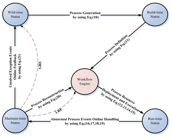 In addition, while the TWfMS experiences continuous transformation via Equations (10–21), its status will also experience iterative Wild-time [43], Build-time, Run-time, and Maintain-time simultaneously, which is corresponding to the original, “as-is”, “to-be”, and “agile-consistent” stages in its life cycle, respectively, partially through the local resilience engineering (LRE) or the global resilience engineering (GRE) road map, as in Figure 4.