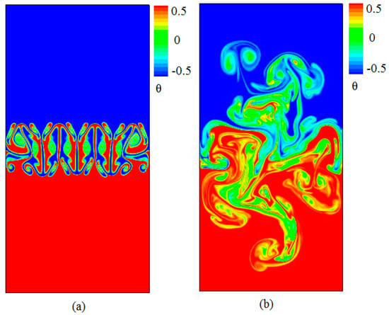 To ensure adequate resolution for and , 2056 × 4112 lattices were implemented using the double distribution LBM of the present work. In the initial stage, the system is at rest. In the upper half of the calculation area, the fluid is cold. The fluid is hot in the lower half of the calculation area. If is greater than , the temperature equals −0.5 in Figure 1 and the temperature equals to 0.5 when is less than H/2. An initial temperature, , is executed in the colder uniform fluid layer and placed on top of the hotter one. To achieve the repeatability of whole flow field, a total of eight independent realizations in RT evolution were performed by giving some perturbed interfaces. In all the simulations, Ag = 0.25, = 9.8 × 109, and the corresponding Prandtl number is . For the vertical boundaries, periodic boundary conditions are executed. The no-slip boundary conditions are adopted in the top and bottom boundary conditions. It is noted that in the previous studies, Zhou et al. [] investigated the statistical properties of kinetic and thermal energy dissipation rates in RT turbulence mixing. Here, some new analysis investigating the viscous and thermal entropy generation are performed in RT turbulence mixing.