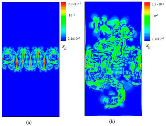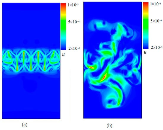 Figure 3 represents the distribution of constant velocity contours with time evolution obtained at times (a) and . Figure 4 displays the snapshots of the viscous entropy generation with time evolution obtained at times and . As shown in Figure 2 and Figure 3, one clearly sees that the viscous entropy generation rate () and the velocity with time evolution always occur in the RT mixing region, which indicates that the loss of flow is also mainly concentrated in this mixing area. It is also further seen that the intense usually concentrates on the steepest velocity gradient in the mixing process, which is consistent with the viscous entropy generation in Rayleigh–Bénard convection [].