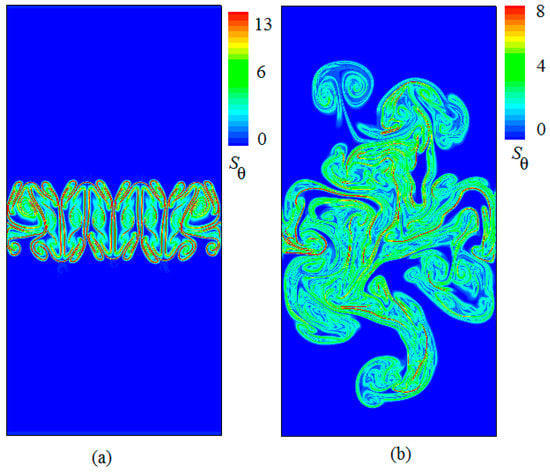 Figure 5 displays the snapshots of thermal entropy generation with time evolution obtained at times (a) and (b) . As shown in Figure 4, one clearly sees that with time evolution the always occurs in the RT mixing region. Further, it was found that as the time evolution progressed, the intense focuses on the interfaces between the hot and cold fluids in the RT mixing process, which is also consistent with the thermal entropy generation in Rayleigh–Bénard convection [].
