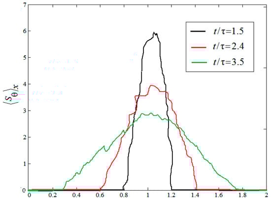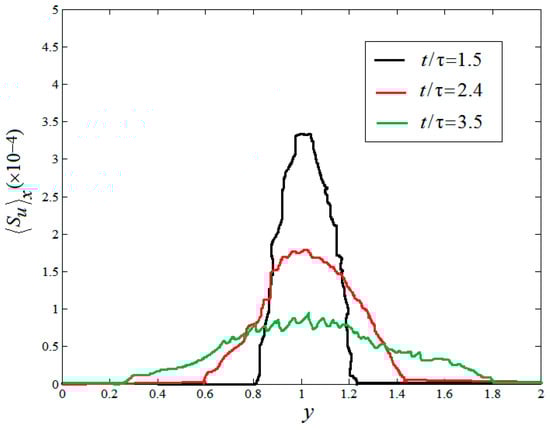 In the above section, the various instantaneous viscous entropy generation rates and thermal entropy generation rates are presented in the field of space. In the following section, the mean values of the viscous entropy generation rate and thermal entropy generation rates are analyzed in space. Figure 6 and Figure 7 display the temporal evolution of the mean vertical profiles of the horizontal and vertical root-mean-square (rms) viscous entropy generation and the thermal entropy generation at times , and , respectively, where is the RMS value of with , and with for a horizontal average. As shown in Figure 5 and Figure 6, one can see that all profiles of and display a similar shape, not far from a parabola at the temporal evolution. However, the behaviors of the amplitudes of two quantities vary as time evolves. It is also found that the mixed changing gradient of two quantities from the center of the region to both sides decrease as time evolves.