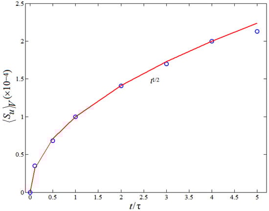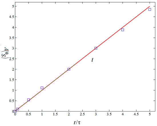 Figure 8 shows the time behaviors of the viscous entropy generation rate normalized by the computational grid spacing. From Figure 8, it is clearly seen that the viscous entropy generation rate always increases with time evolution. The solid line represents the theoretical prediction fitted approximately by the least square method according to the numerical results of LBM in Figure 8. A “smooth” function is approximately achieved.
