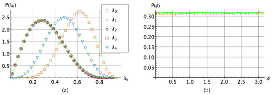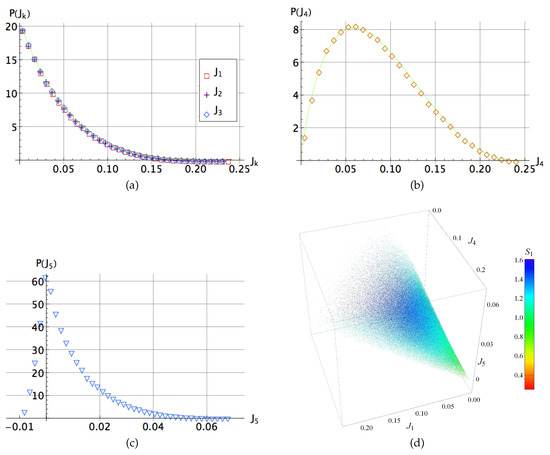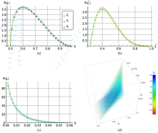 In Figure 4b–d we show the probability distributions of the pairwise anisotropic strengths as well as the probability distribution of the invariants and for an ensemble of three-qubit random states. We approximate numerically the distribution of the quantities , and by respective beta distributions: