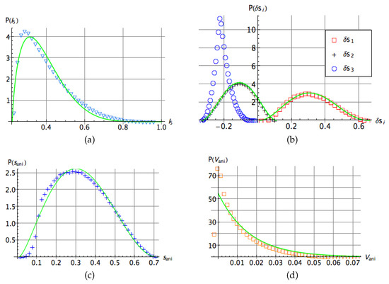 Probability distribution of: (a) the Kempe invariant (the green line stands for the probability distribution (16)). (b) The pairwise anisotropic strengths with . (c) The invariant and (d) The invariant . Solid lines in all cases correspond to the best numerical fit.