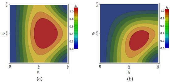 (a) The minimal decomposition entropy level curves as function of the parameters and for a state in class 3a; (b) Same as (a) for a state in class 3b.