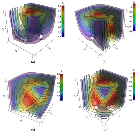 Surfaces of equal entanglement for classes 4 measured with respect the minimal decomposition entropy as function of the parameters , and defining each class. Different panels correspond to a state in: (a) Class 4a; (b) Class 4b; (c) Class 4c; (d) Class 4d.