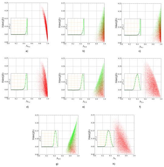 The invariants are labeled according to the notation used by Sudbery [13]. Note that the squared norm of the state (1) is in itself a polynomial invariant usually denoted as . In Figure 2a–c we show the probability distribution of the above set of invariants over an ensemble of random states. Moreover, as for the quantity is related with the linear entropy, , the corresponding distributions show that the entanglement of each qubit with the other two is the same no matter which partial trace is performed. On the other hand, the invariants in terms of the coefficients are written as [13]: