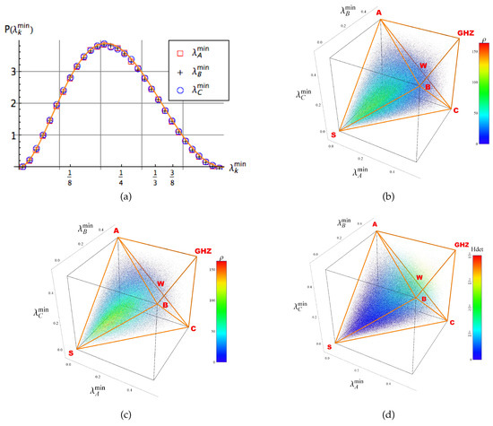 (a) Probability distribution of the minimal eigenvalue of a single qubit reduced system (36). (b) An ensemble of three-qubit random states depicted in the entanglement polytope. The color scale stands for the joint probability distribution. (c) Detail of (b): A transversal section by the plane which contains the points S, C and . (d) The ensemble of three qubit random states labeled by colour settled according to the value of the invariant .