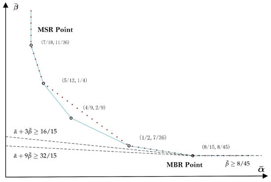 which is weaker than the outer bound (7) by the fact that . Figure 1 shows the outer bound (14) for the MDC-R problem with . As illustrated, (14) is weaker than (7), and both are only tight at the MBR point .